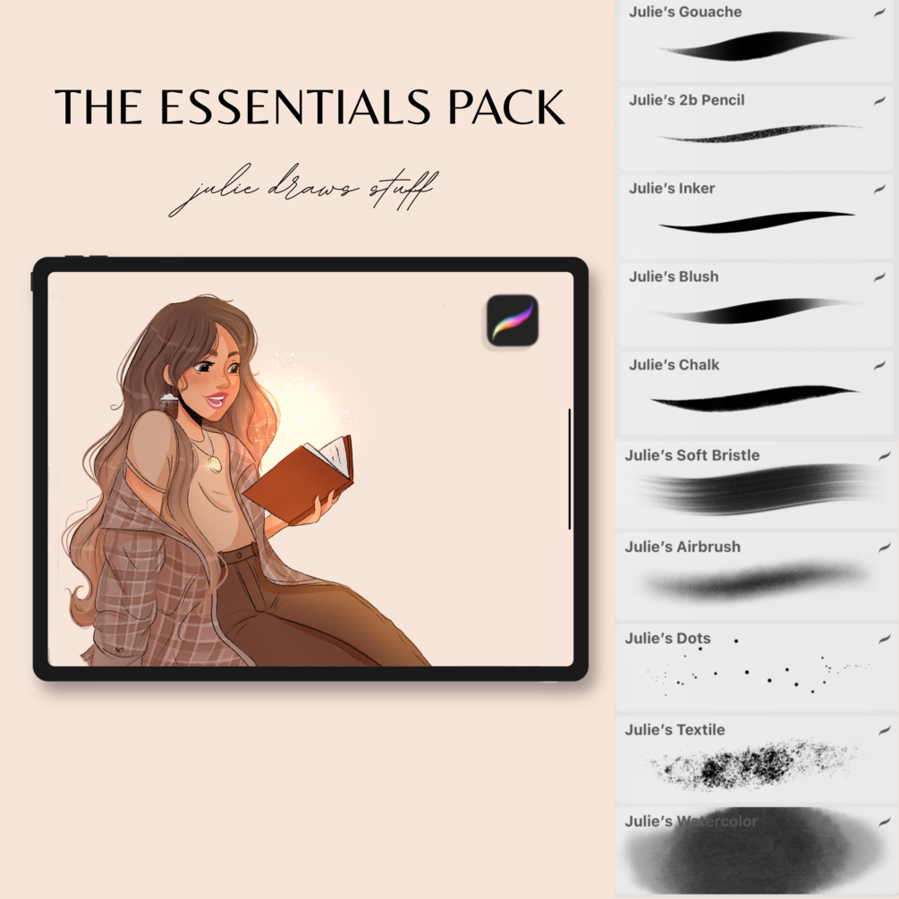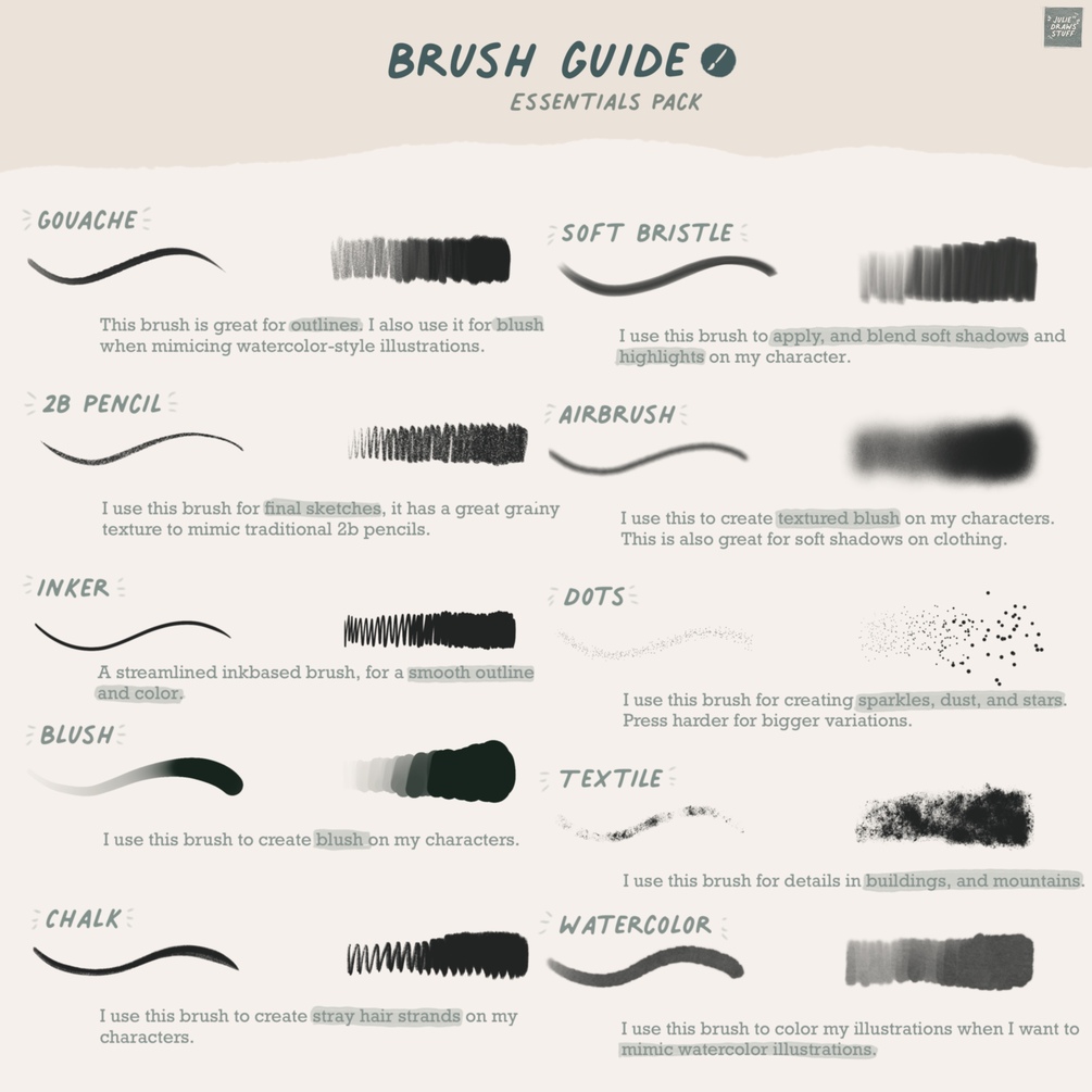 The ESSENTIALS brush set comes with: 10 brushes + PDF guide.