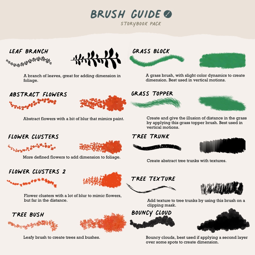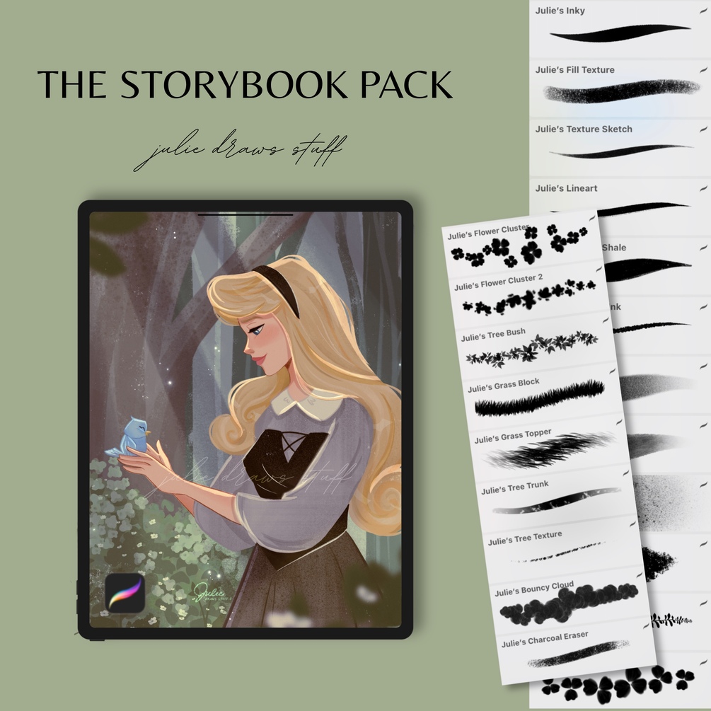 The STORYBOOK brush set focuses on texture and storytelling elements. It comes with: 20 brushes + 1 eraser brush (21 total).